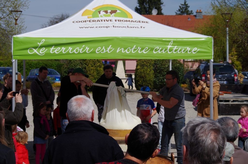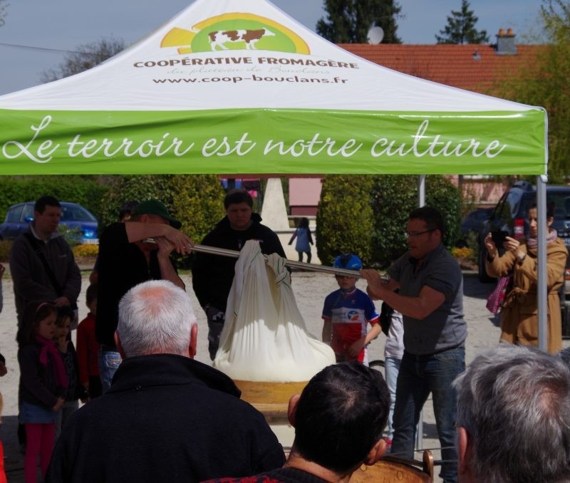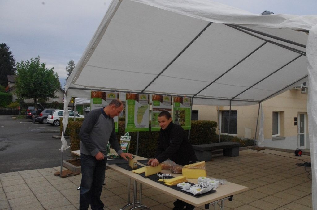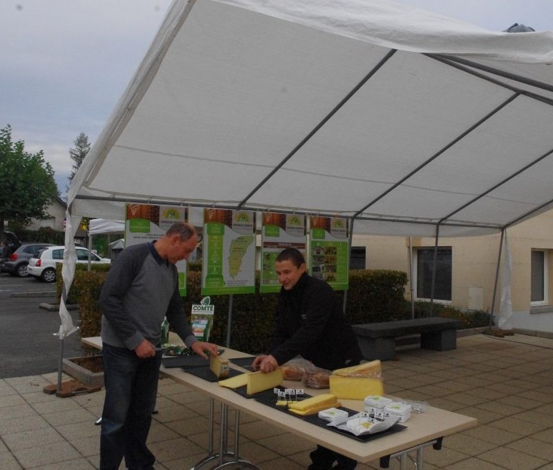 Retour sur notre Marché des Producteurs à Roche-Lez-Beaupré & Naisey-les-Granges Grâce à cette animation les producteurs ont expliqué à de nombreux clients le principe de la filière comté et de la coopérative car beaucoup de nos clients de Roche ne savait que le magasin appartenait à des agriculteurs regroupés qui gèrent la production de lait sur chacune de leur exploitation et la fabrication du comté dans un atelier. Les deux fromagers présents (Philippe GUILLAUME notre maître fromager et Benoit QUENTIN maître fromager de Passavant) ont impressionnés les visiteurs du marché par leur savoir-faire. Nous avons également expliqué les différences de goût de nos comtés en fonction de l’affinage (de 10 à 30 mois) et de la période de fabrication (pâte jaune quand les vaches sont dans les prés et pâte blanche quand les vaches sont dans les étables). De nombreux clients ont découvert ou redécouvert le P’tit René. Un moment de convivialité et d’échange autour d’un café ou d’un verre offert par la mairie de Roche lez Beaupré. |